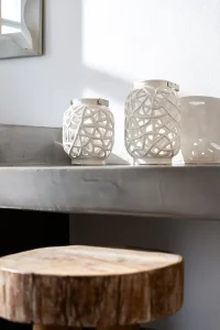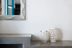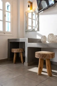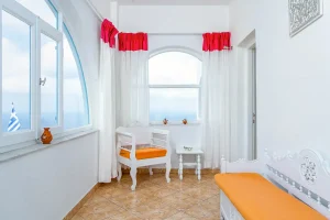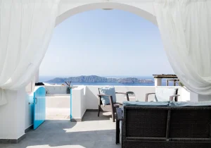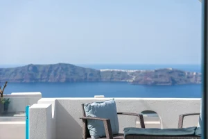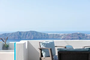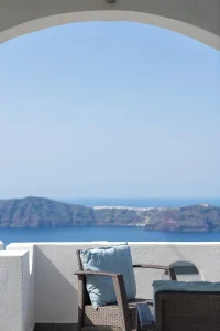 Each of these rooms opens onto a cozy veranda with a seating area where the caldera takes center stage. The volcanic landscape, the shimmering Aegean, the distant silhouette of the volcano — all of it spreads out before you in unhurried silence. Morning coffee here feels like a small ceremony. Evening wine, as the sky shifts through gold and pink and violet, feels like a privilege.